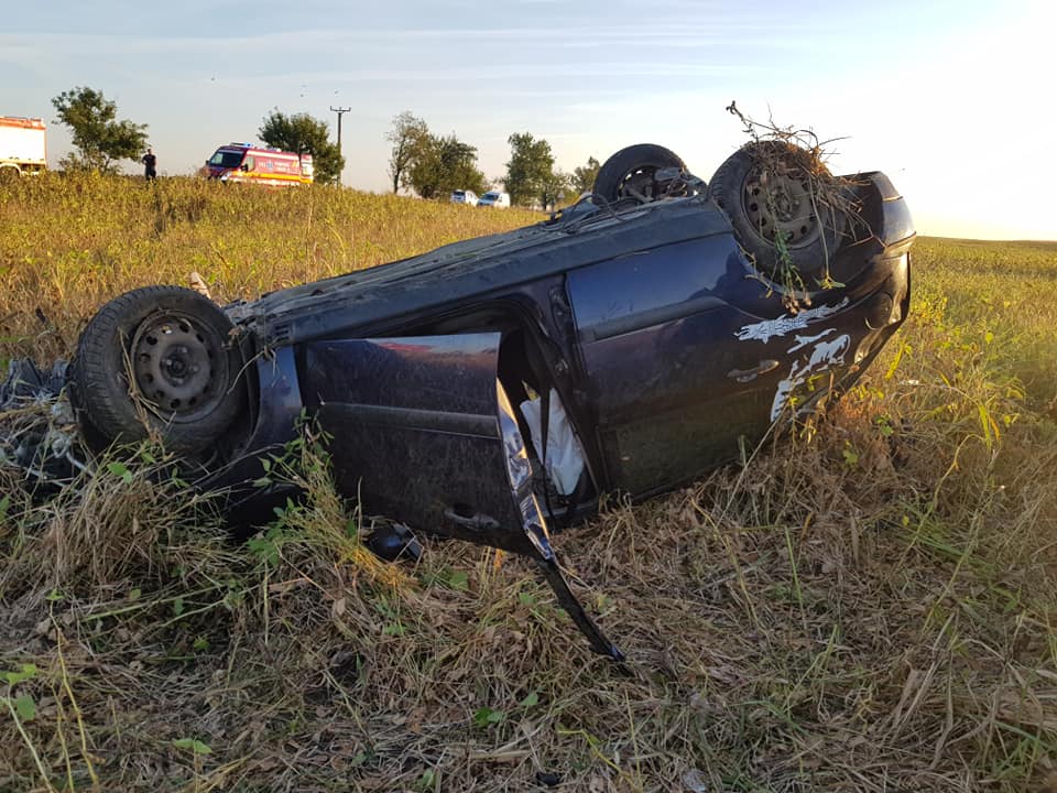 Maşina implicată în accidentul petrecut la aproximativ ora 7:00, a ajuns răsturnată în afara carosabilului.