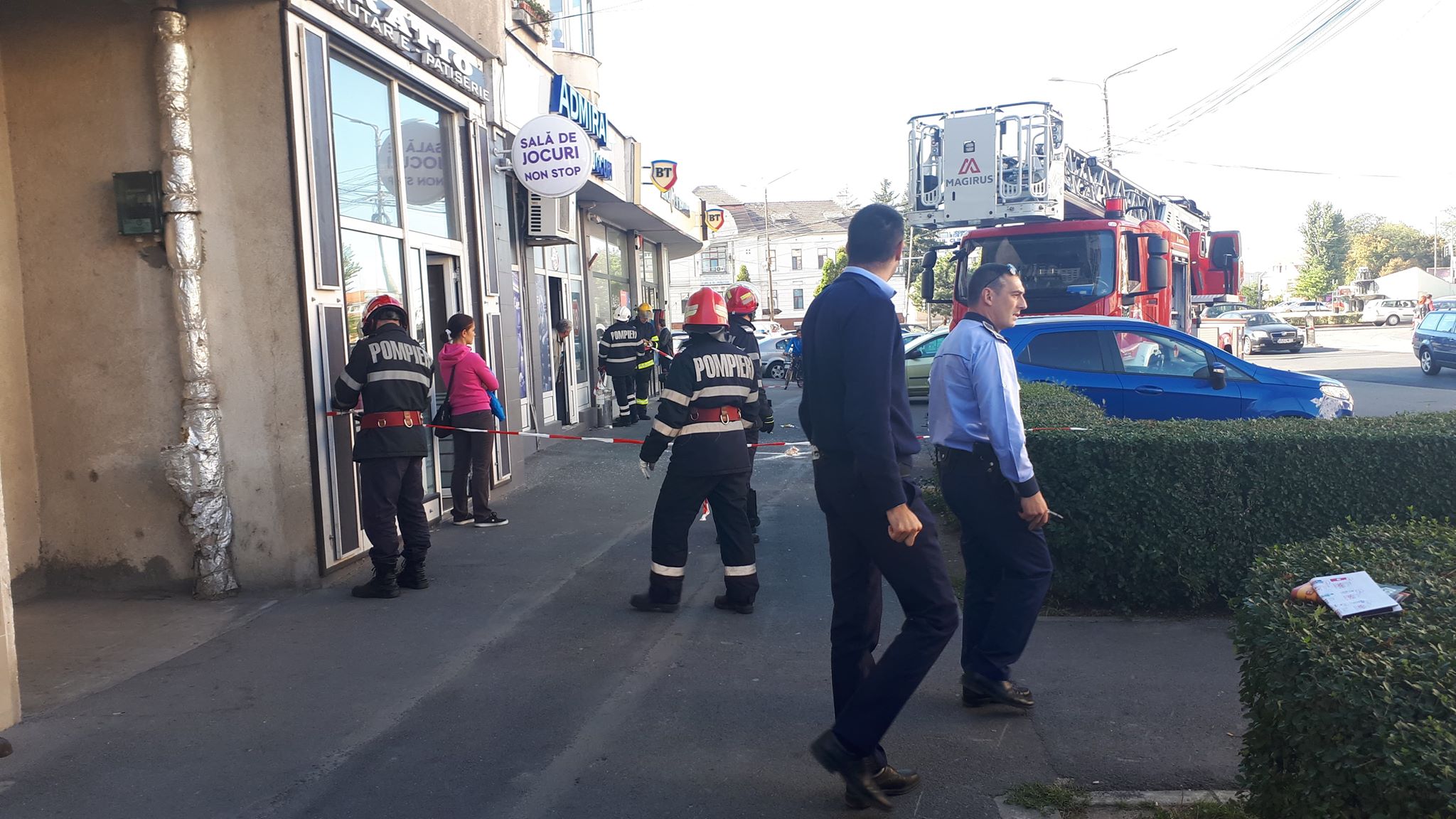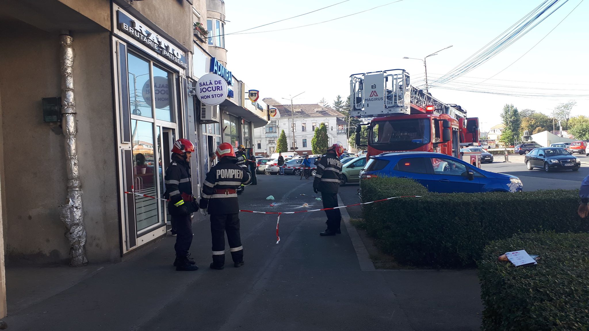 Pompierii din cadrul ISU Arad au securizat zona, nemaiprmiţând accesul trecătorilor în porţiunea supusă „tir”-ului de la etaj.