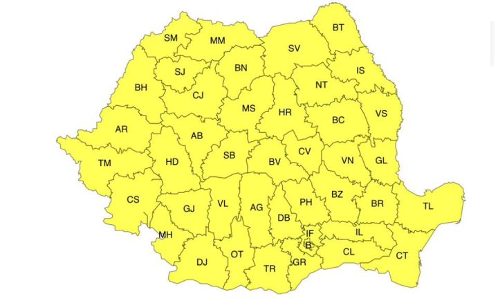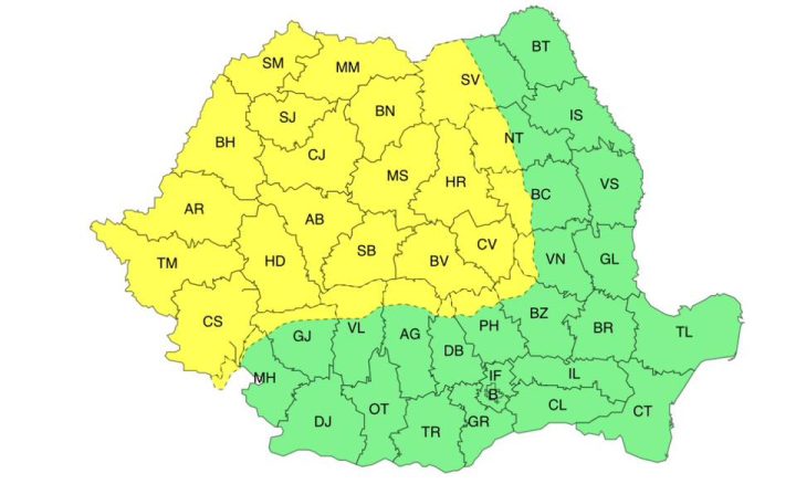 Administrația Națională de Meteorologie (ANM) a emis două coduri galbene pentru județul Arad.