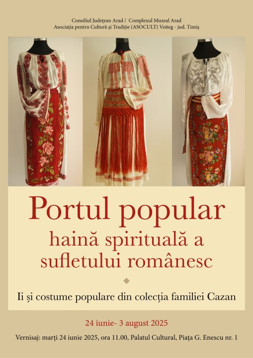 Expoziția „Portul popular – Haină spirituală a sufletului românesc. Ii și costume populare din colecția familiei Cazan” este deschisă la Complexul Muzeal Arad (Palatul Cultural – Piața George Enescu 1, intrarea dinspre Parcul Copiilor) până duminică, 3 august 2025.
