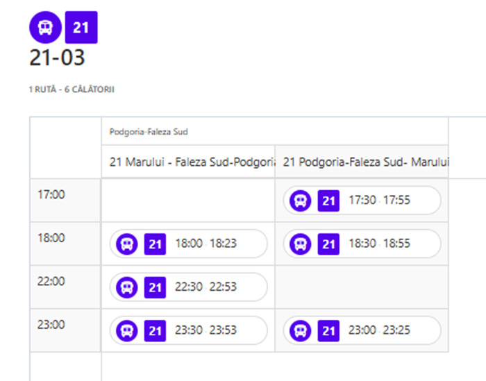 Astfel, în zilele de 29 și 30 august, linia de autobuz 21 va circula pe traseul Podgoria – Faleza Sud de la orele 17.30, 18.30 și 23 și retur (Faleza Sud-Podgoria) de la orele 18, 22.30 și 23.30.