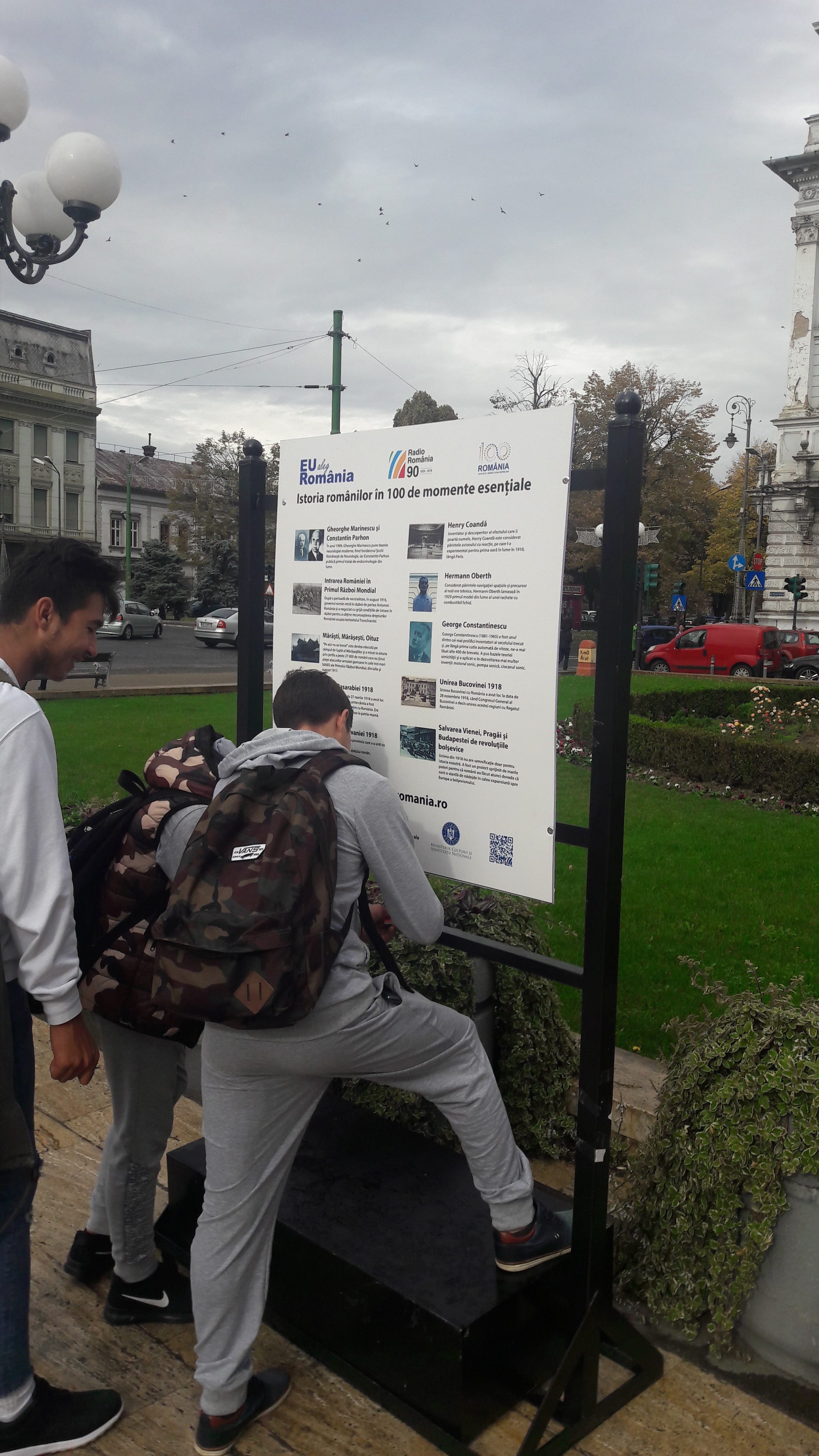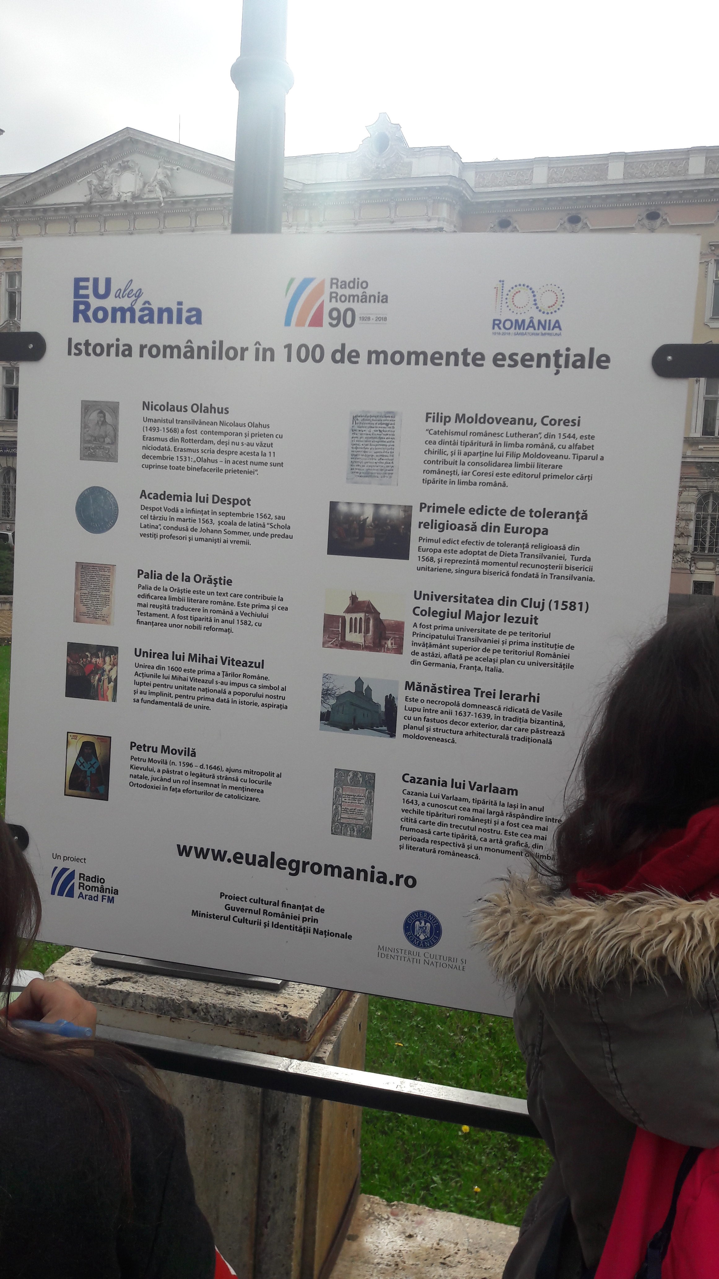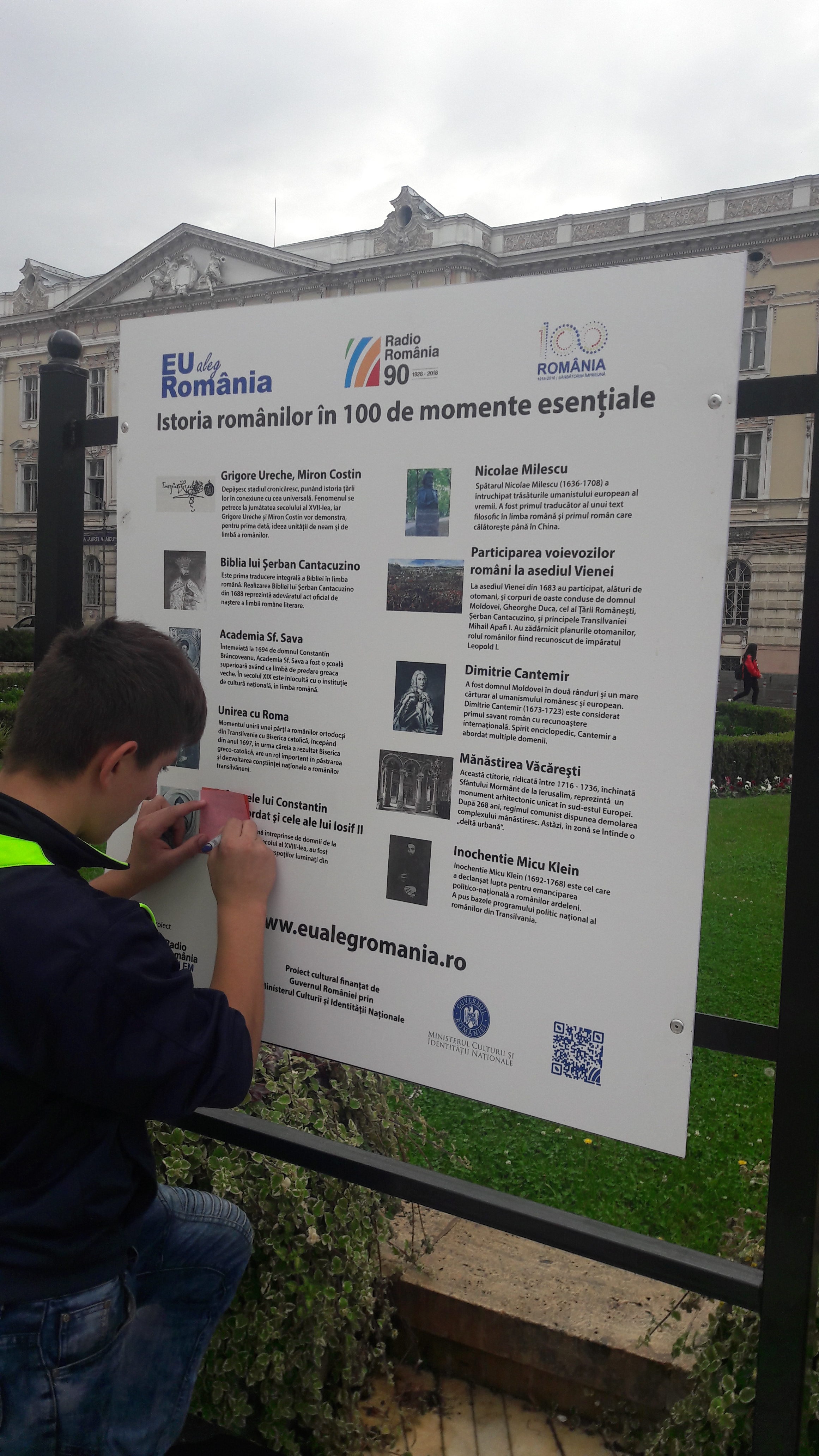 Elevii au observat pe panouri, 100 de momente esenţiale din istoria românilor, precum: ,,Mitul lui Dracula şi semnificaţia lui”, ,,Învăţăturile lui Neagoe Basarab – primul monument al literaturii române”, ,,Bătălia de la Podul Înalt”, ,,Marea victorie obţinută de Ştefan cel Mare contra oastei otomane şi semnificaţia sa europeană” sau ,,Rovine, strălucita victorie antiotomană a lui Mircea cel Bătrân” sunt câteva dintre imaginile surprinse de campania ,,Eu aleg România”.