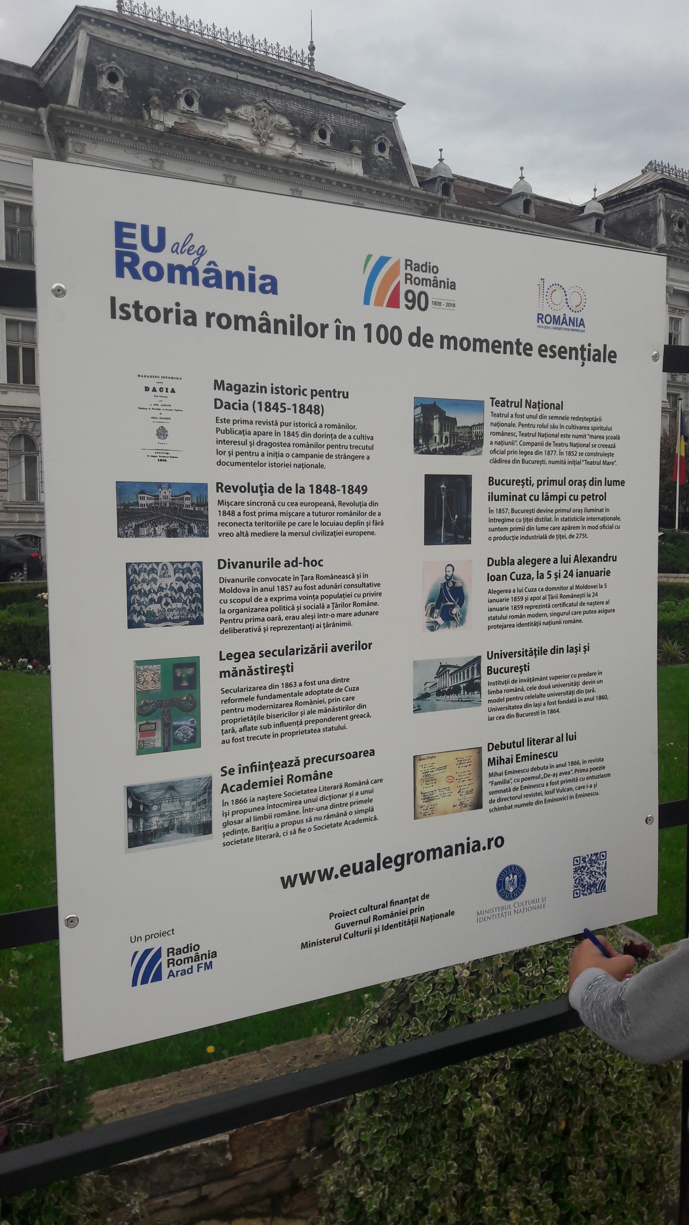 Pentru a evidenţia momentul Radio România Arad FM a deschis expoziţia ,,Eu aleg România – 100 de momente esenţiale din istoria românilor” la Arad pe platoul din faţa Primăriei municipiului. Expoziţia prezintă vizitatorilor 10 panouri ilustrate cu 100 de momente istorice ale poporului român, prin fotografii, texte, dar şi un QR Code cu trimitere către aplicaţia online a proiectului www.eualegromania.ro.