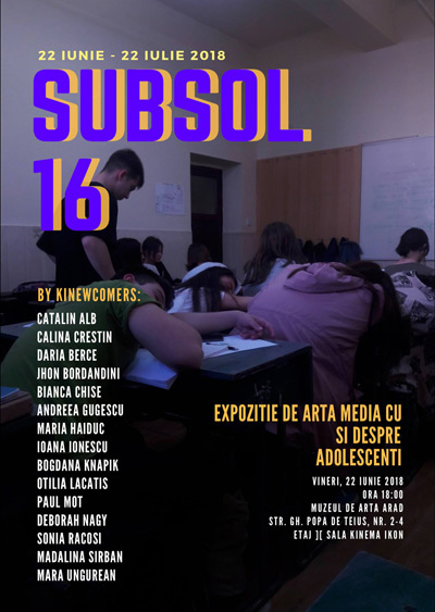 Vineri, 22 iunie, orele 18.00, în sala de expoziții kinema ikon a Muzeului de Artă Arad (str. Gheorghe Popa 2-4), tinerii artiști ai grupului kinema ikon vor prezenta expoziția de artă media cu și despre adolescenți „subsol 16 by kinewcomers”.