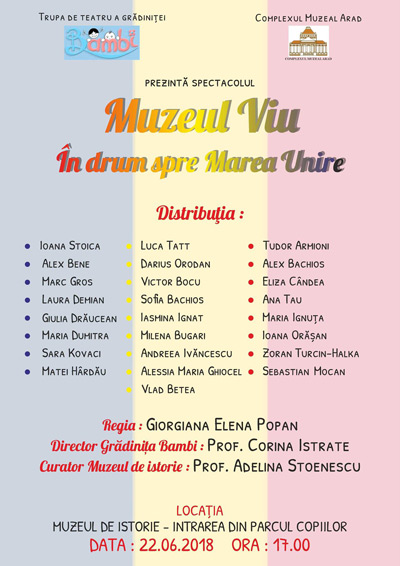 Spectacolul este susţinut de copiii din trupa de teatru „Bambi”, în regia actriţei Giorgiana Elena Popan. Evenimentul, realizat de preșcolari, este un prilej de descoperire a poveștilor de viață, scrise de arădeni celebri, care la 1918, au construit România Mare (Vasile Goldiș, Sever Bocu, Ioan Suciu, Ștefan Cicio Pop, Sava Raicu, Iosif Moldovan, Ioan Robu, Mihai Veliciu, Iustin Marsieu, Valeriu Seredan, episcop I.I. Papp), dar și o intalnire cu personalități din istoria națională.