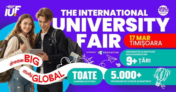 Pe 17 martie, la Iulius Congress Hall (Iulius Mall) din Timișoara, are loc IUF – The International University Fair, cel mai mare eveniment educațional din Europa de Sud-Est. Elevii, studenții și părinții pot descoperi programe de studiu din România și din străinătate, discuta direct cu reprezentanții universităților și participa la sesiuni dedicate orientării în carieră.