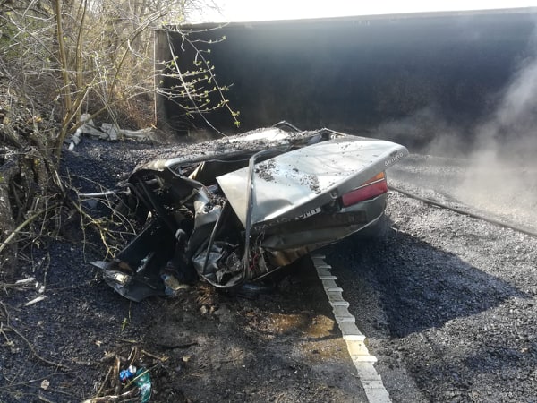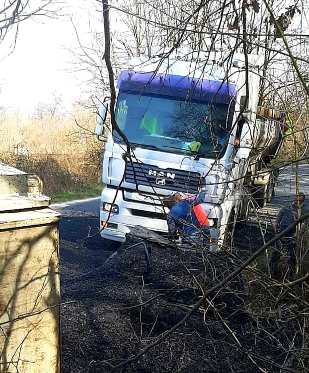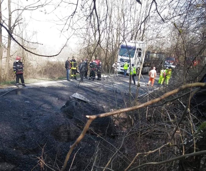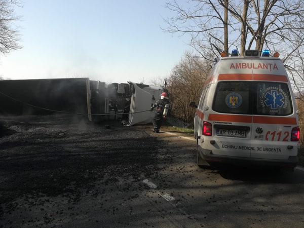 Potrivit Inspectoratului pentru Situații de Urgență (ISU) Arad, în evenimentul rutier au fost implicate un autoturism și un camion încărcat cu bitum fierbinte.