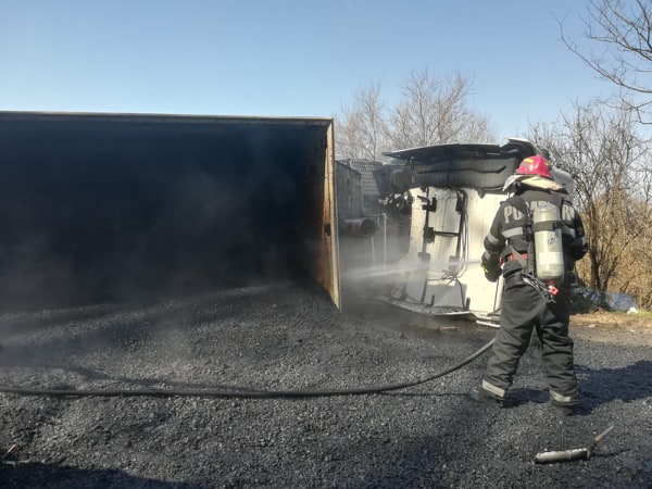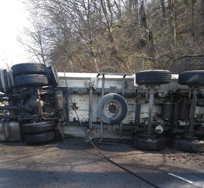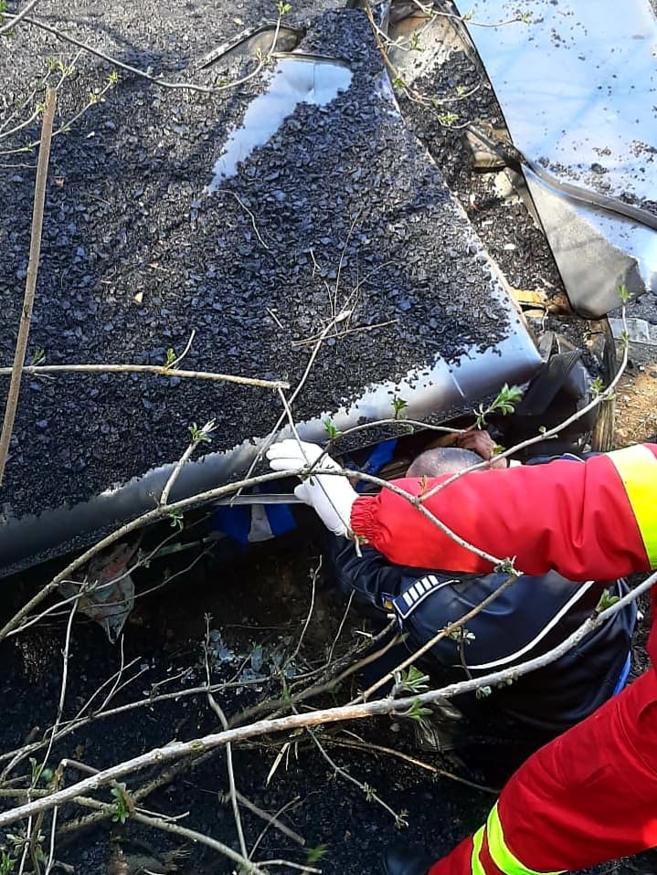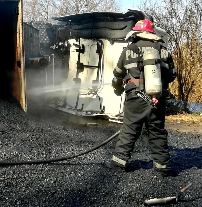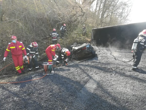ISU Arad informează că victima a fost scoasă în viață din autoturismul prins sub camionul răsturnat. Persoana prezintă traumatisme și arsuri pe membrele inferioare.