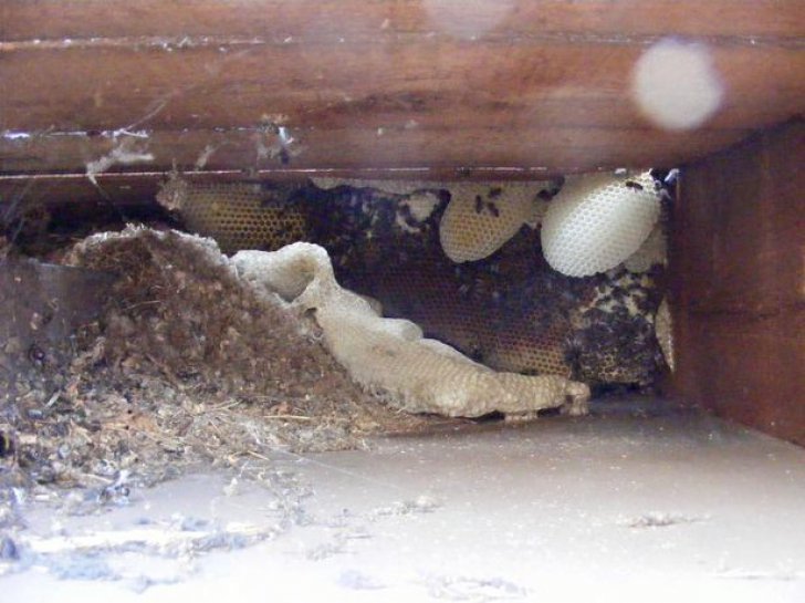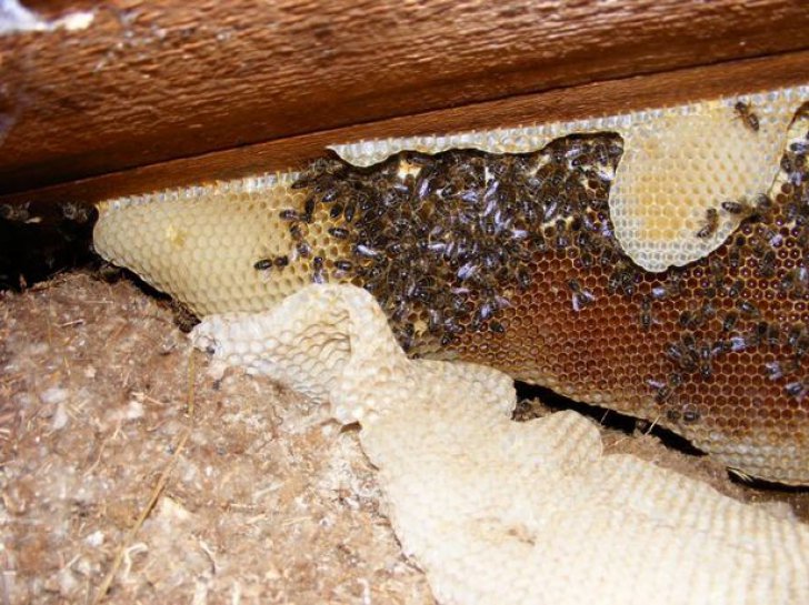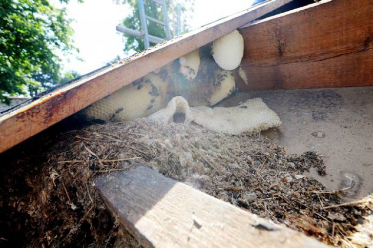 Uriașa familie de albine își făcuse stupul în acoperișul clădirii, iar din cauza temperaturilor extrem de ridicate din această vară, ceara din faguri s-a topit, iar mierea a început să se prelingă pe pereți.