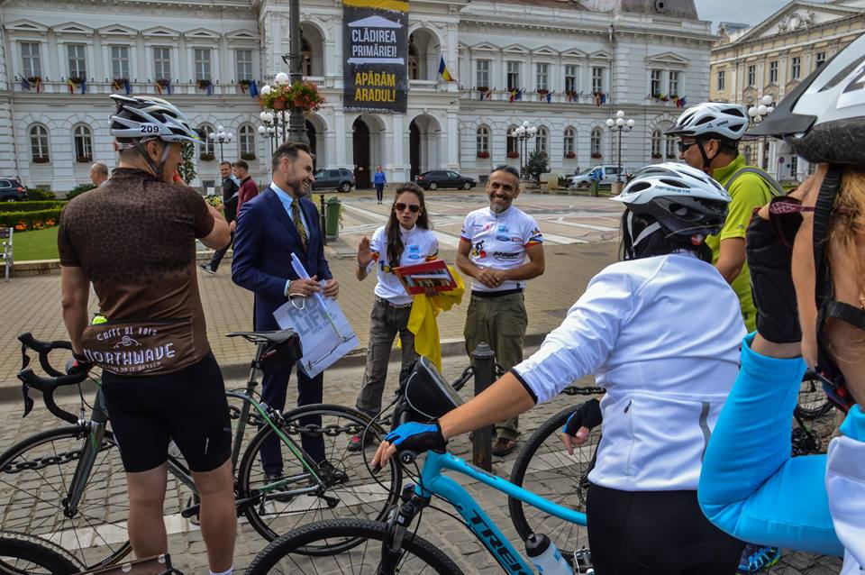 Echipa Ardealului și Banatului a traversat, în cursul dimineții, centrul orașului, participanții fiind întâmpinați, în fața Palatului Administrativ, de către edilul Gheorghe Falcă. Acesta le-a înmânat steagul municipiului Arad, declarând, cu această ocazie: „Chiar dacă nu am putut onora invitația participanților la marșul Pedalăm pentru România de a-i însoți, am ținut neapărat să îi salut și să le urez drum bun și în siguranță spre Cetatea-simbol a Marii Uniri. Prin intermediul lor, steagul municipiului Arad va ajunge la Alba Iulia.”