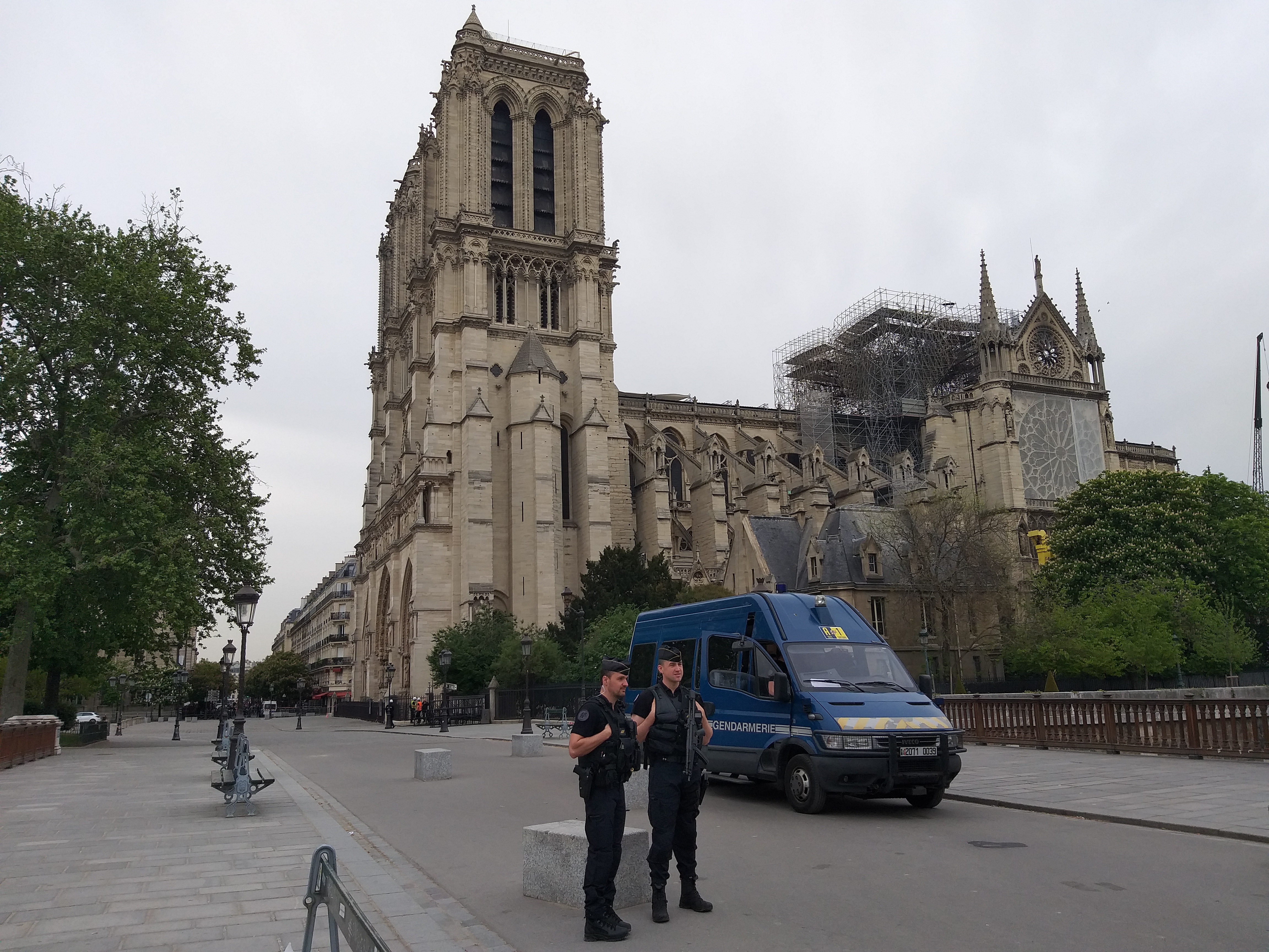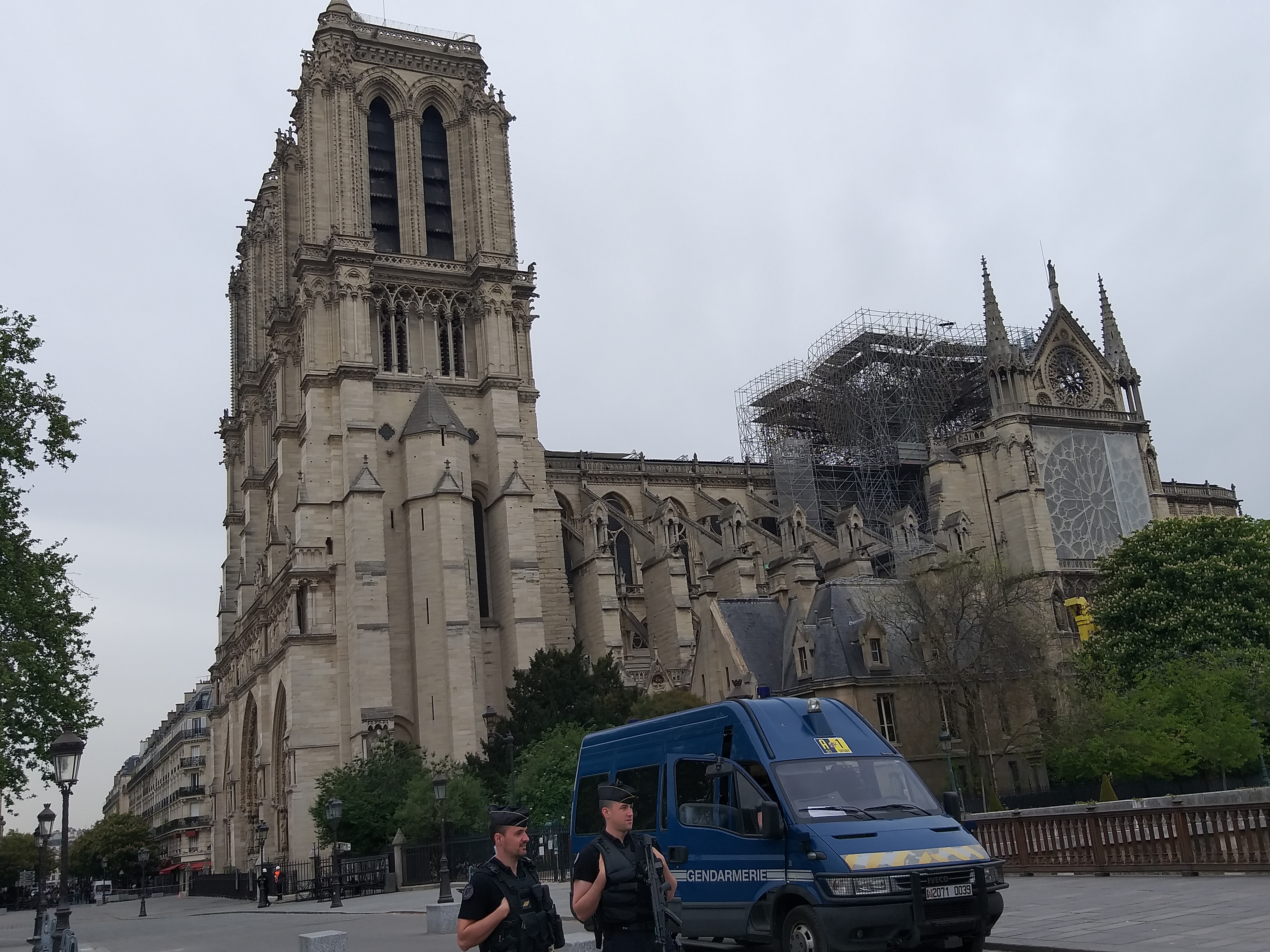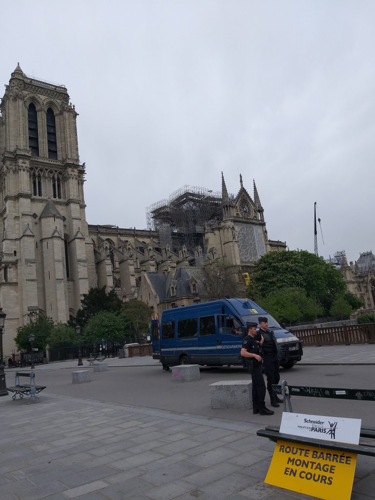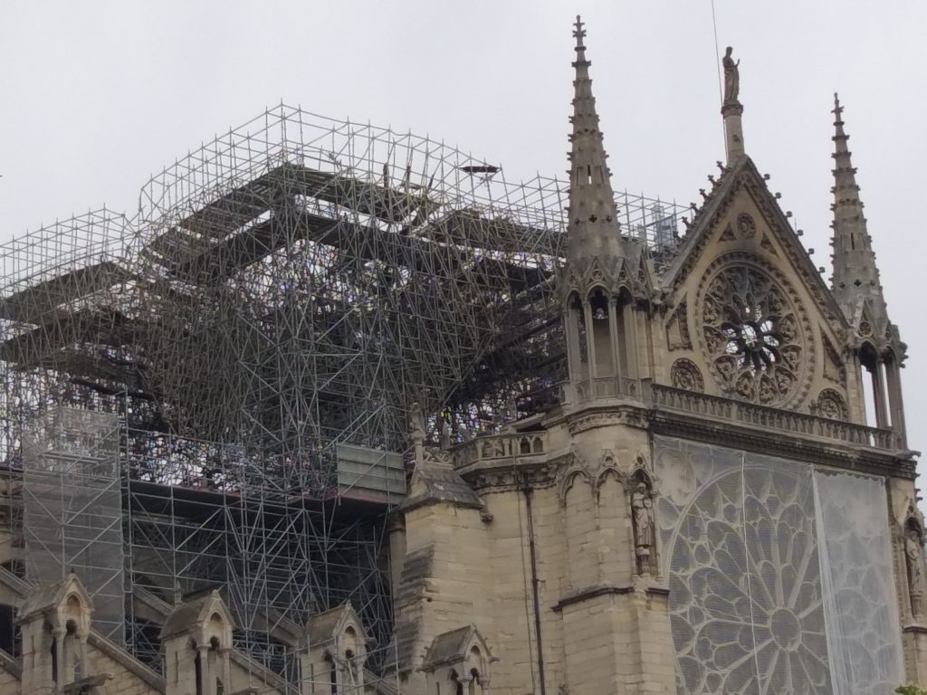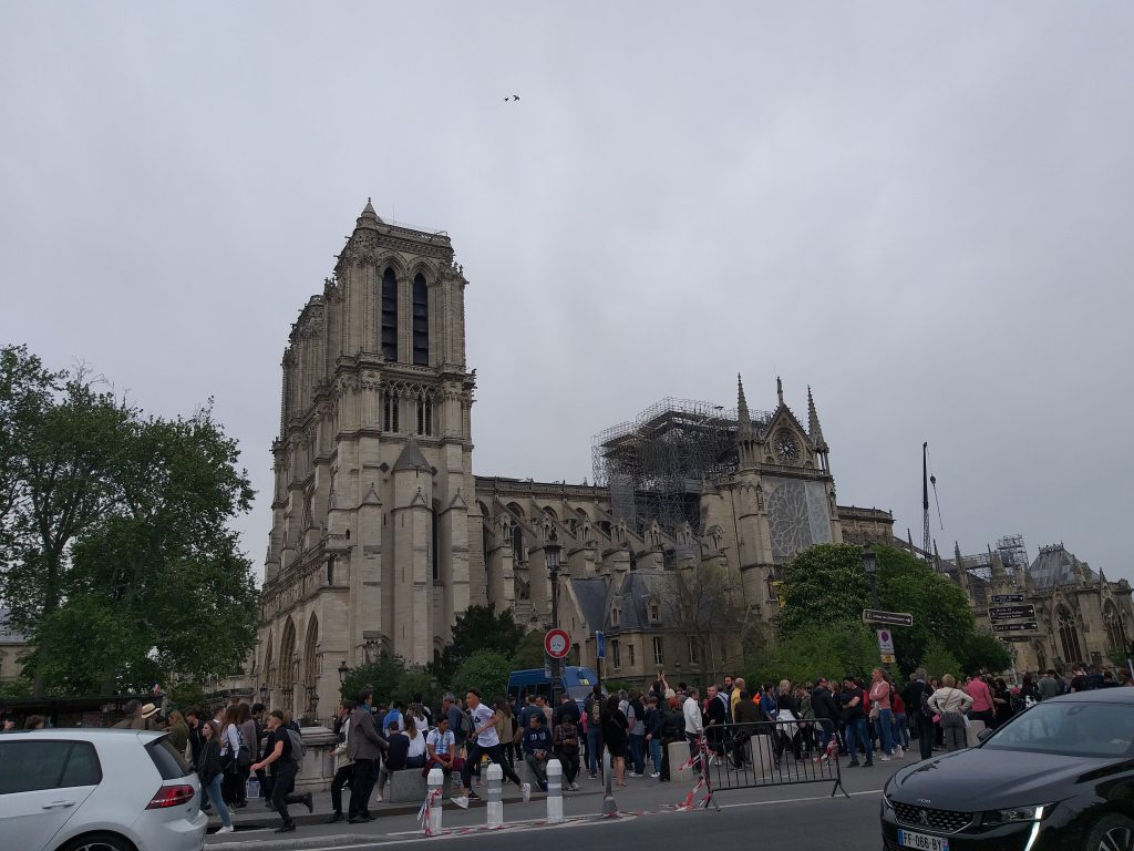 Din față, nu se observă aproape nimic. Evident, lipsește turla, dar în rest, din fericire, catedrala e în picioare. Când te apropii însă, ajungi în partea laterală și vezi urmările incendiului. În loc de acoperiș e plin de schele și se văd „rănile” lăsate de foc. Deși era multă lume, atmosfera era destul de apăsătoare, iar oamenii nu prea zâmbeau…