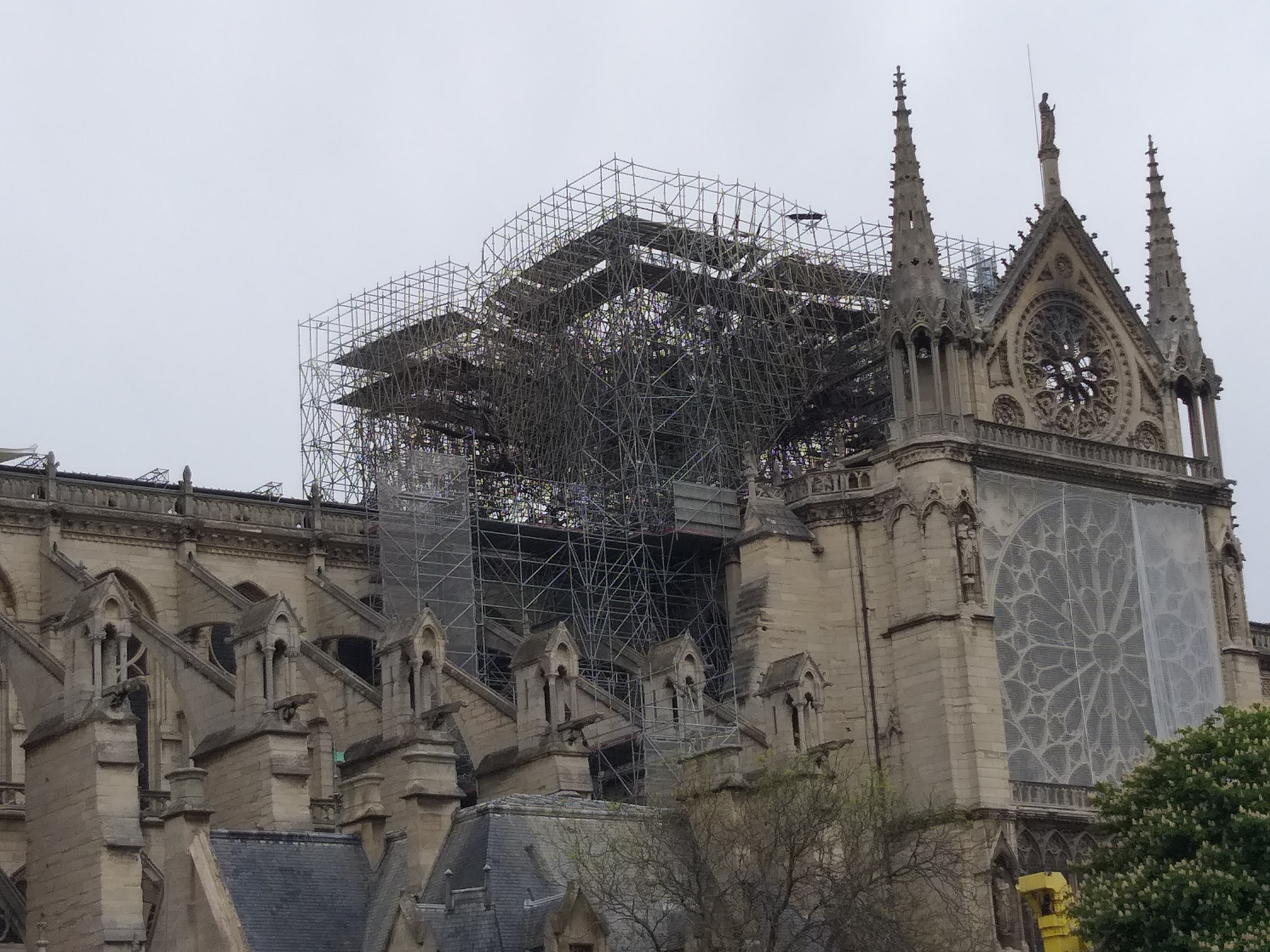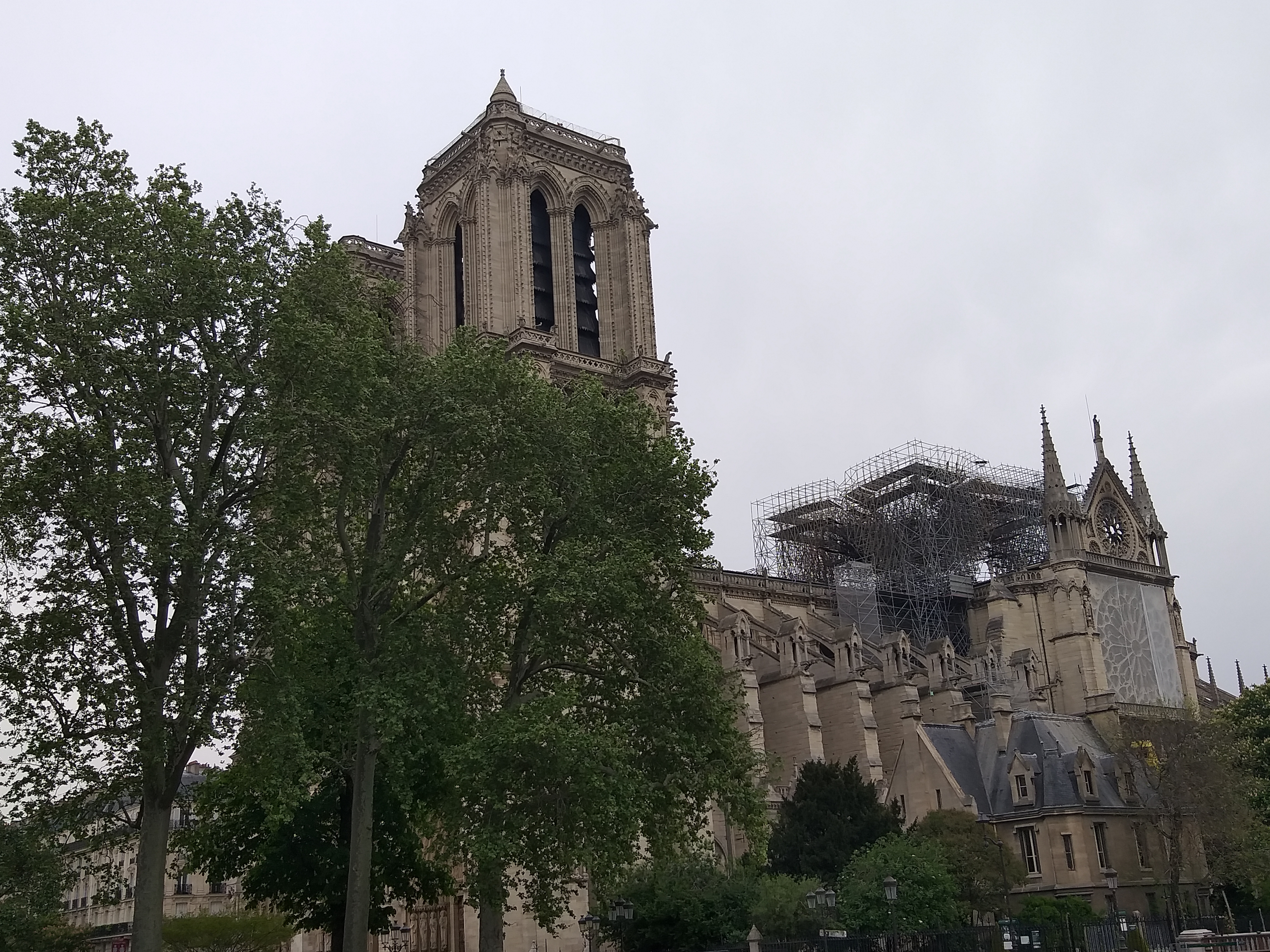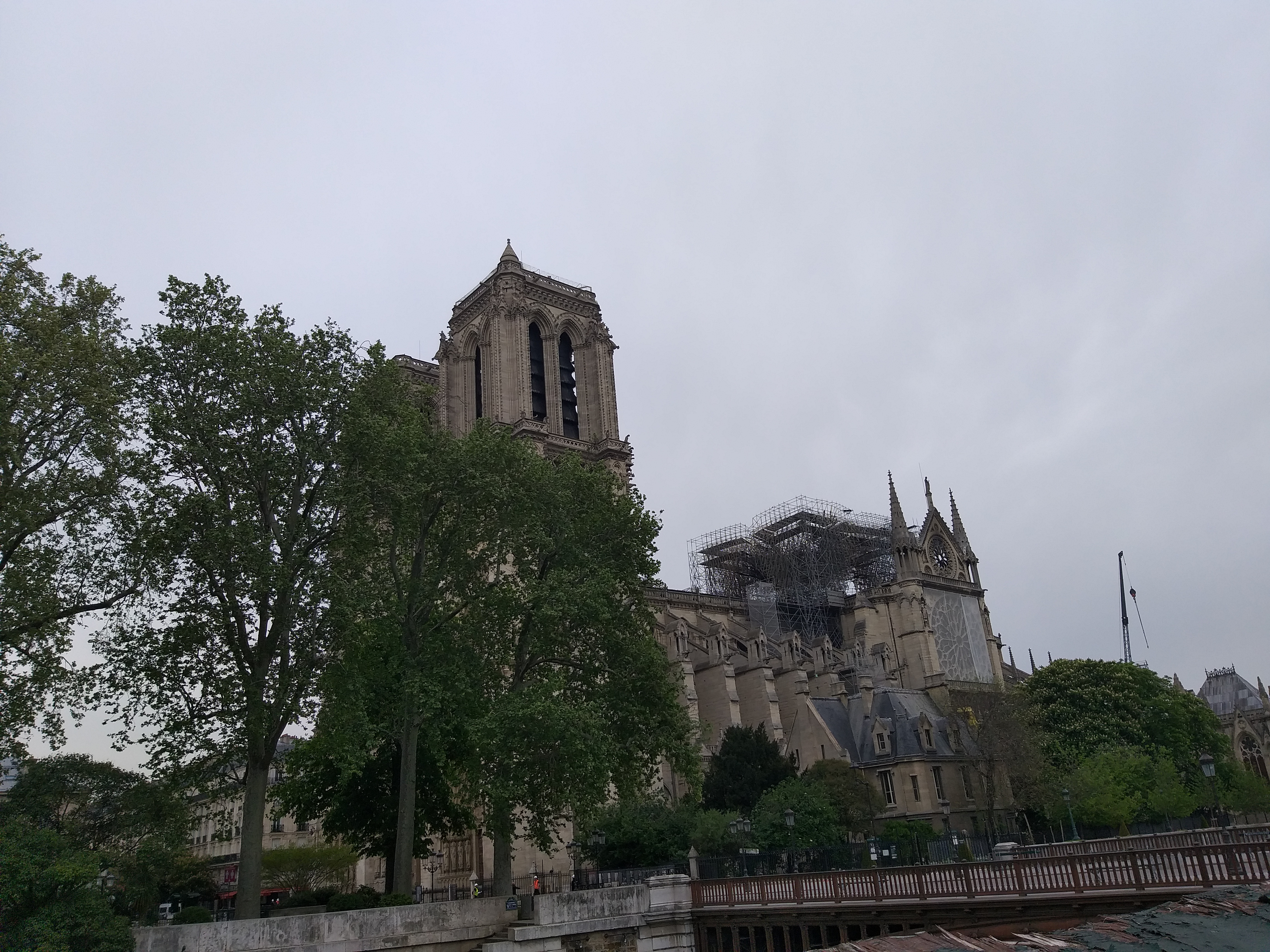 Din față, nu se observă aproape nimic. Evident, lipsește turla, dar în rest, din fericire, catedrala e în picioare. Când te apropii însă, ajungi în partea laterală și vezi urmările incendiului. În loc de acoperiș e plin de schele și se văd „rănile” lăsate de foc. Deși era multă lume, atmosfera era destul de apăsătoare, iar oamenii nu prea zâmbeau…