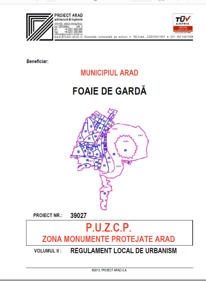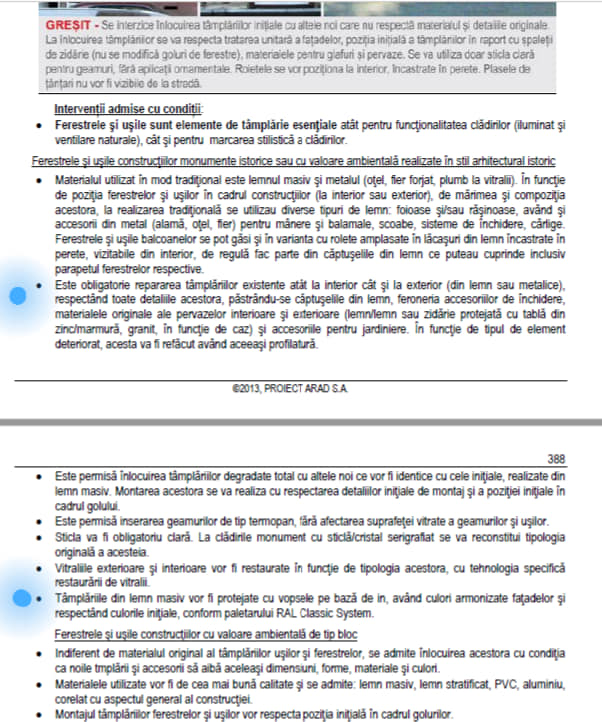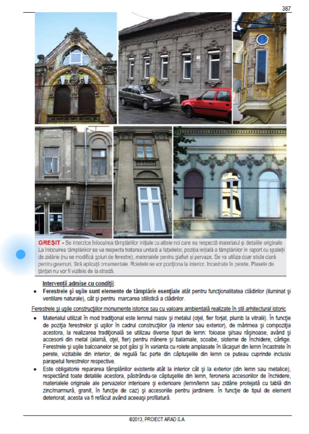 „În Planul Urbanistic Zonal (P.U.Z.C.P. vol II, Regulament Local de Urbanism) adoptat de către C.L.M. Arad prin Hotărârea 201 din 17 iulie 2014, sunt prevăzute tipurile de intervenții permise, respectiv interzise pentru acest gen de restaurări. Cele trei volume ale P.U.Z.C.P, pe care le-am parcurs aprofundat la acțiunea de salvare a Parcului Eminescu din anul 2015, sunt documente impecabil redactate și au valoare de lege, dar din păcate nu prea se ține cont de ele. La pagina 386 începe un capitol exclusiv dedicat tâmplăriilor și, așa cum se vede în facsimilele atașate, este obligatorie repararea elementelor existente respectând toate detaliile originale. Ușile sau ferestrele pot fi înlocuite doat dacă SUNT DEGRADATE TOTAL și este obligatoriu să fie IDENTICE CU CELE INIȚIALE: material, cod de culoare și detaliile șprosurilor. Pe fațade încă există câteva ferestre originale și se vede, atât la fața locului, cât și din fotografiile atașate, că nu sunt degradate total. Cel mult ar fi trebuit schimbate unele dintre elementele subțiri, dar cadrele sunt solide. Voi solicita Departamentului Tehnic din Primăria Arad, precum și Arhitectului-Șef al orașului să facă public raportul și numele experților care au decis că tâmplăria originală a fost degradată total, precum și motivele pentru care au schimbat culoarea și desenul original al șprosurilor”, atrage atenția Bulumac.