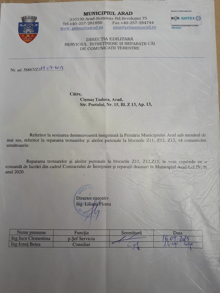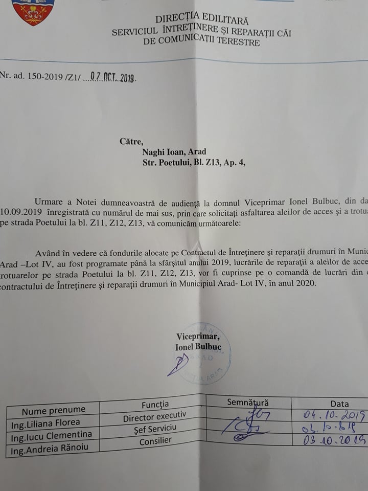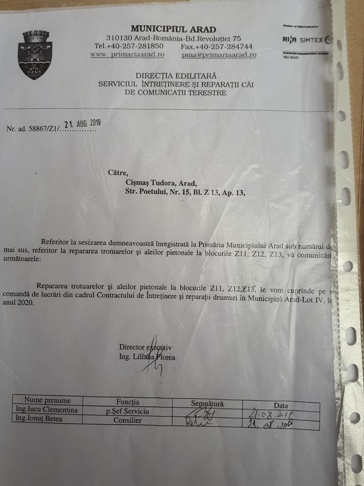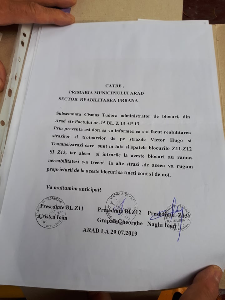 Locatarii au crezut că măcar acum, în plină regenerare urbană, o să li se amenajeze parcarea şi aleile spre blocuri. Surpriză, însă! Regenerarea urbană a ocolit Z 12 şi Z 13. A fost momentul în care au început demersurile la Primăria Municipiului Arad, de unde li s-a răspuns să aibă răbdare (vedeţi fotocopii, mai jos). Toate la timpul lor, nu?, în condiţiile în care au fost primii din Vlaicu care şi-au demolat garajele…
