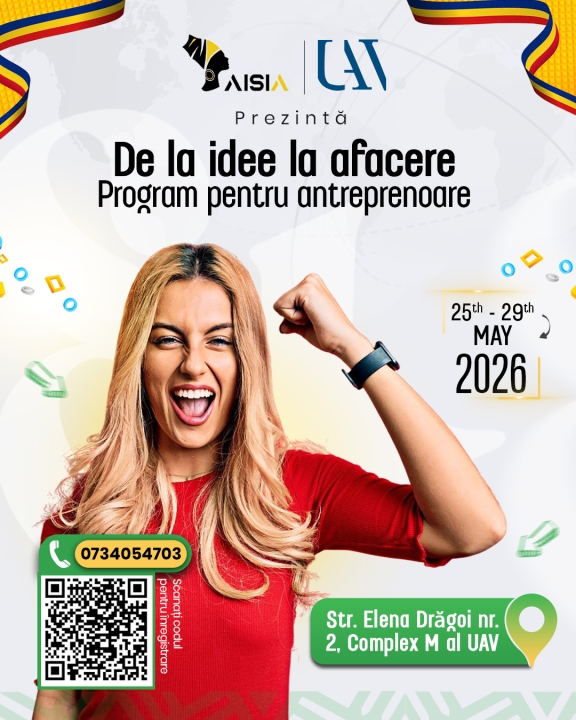 AISIA e.V., în parteneriat cu Universitatea „Aurel Vlaicu” din Arad, prin Centrul de Limbi Moderne, organizează în perioada 25–29 mai, în Arad, un training gratuit dedicat exclusiv femeilor interesate de dezvoltarea competențelor antreprenoriale.
