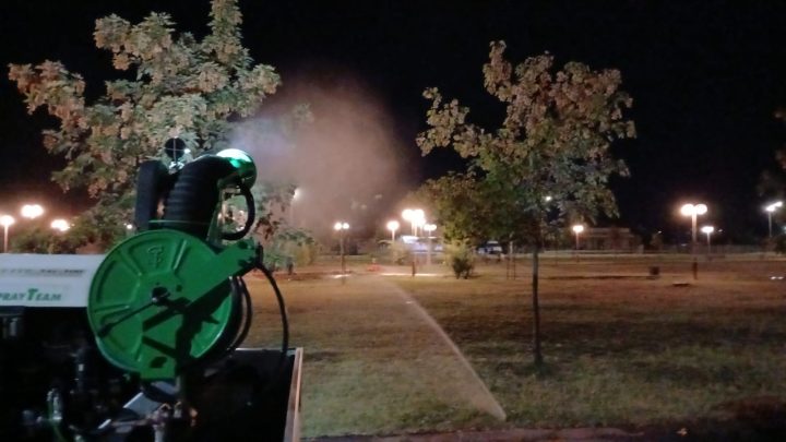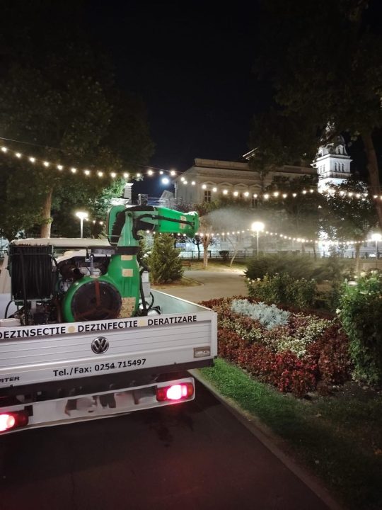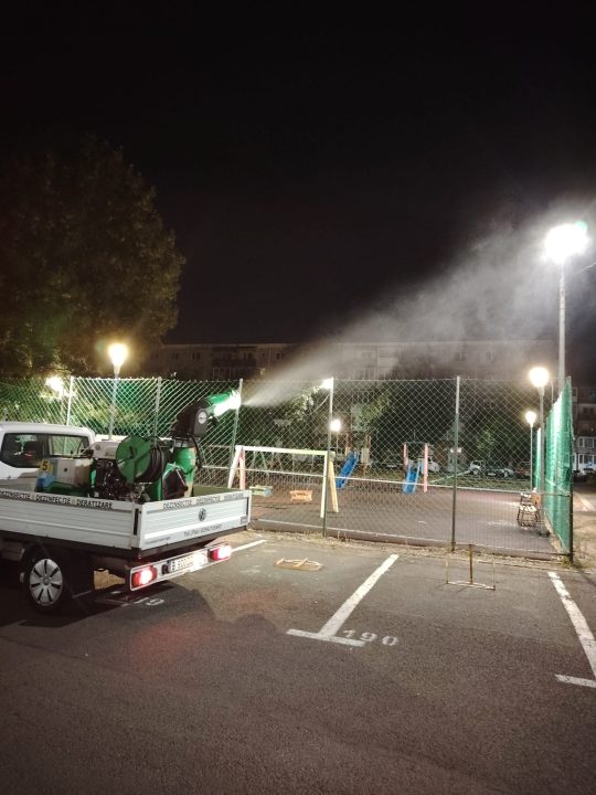 Tratamentul terestru împotriva țânțarilor adulți se va desfășura numai pe timp de noapte, în interval orar 21 – 4.30, în zonele cu vegetație: spațiile deschise din domeniul public și privat al municipiului (parcuri, spații verzi, maluri de lac și alte asemenea, prin termonebulizare); spațiile deschise ale persoanelor fizice și juridice, de pe toate aliniamentele stradale, adiacent acestor spații.