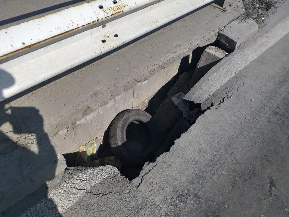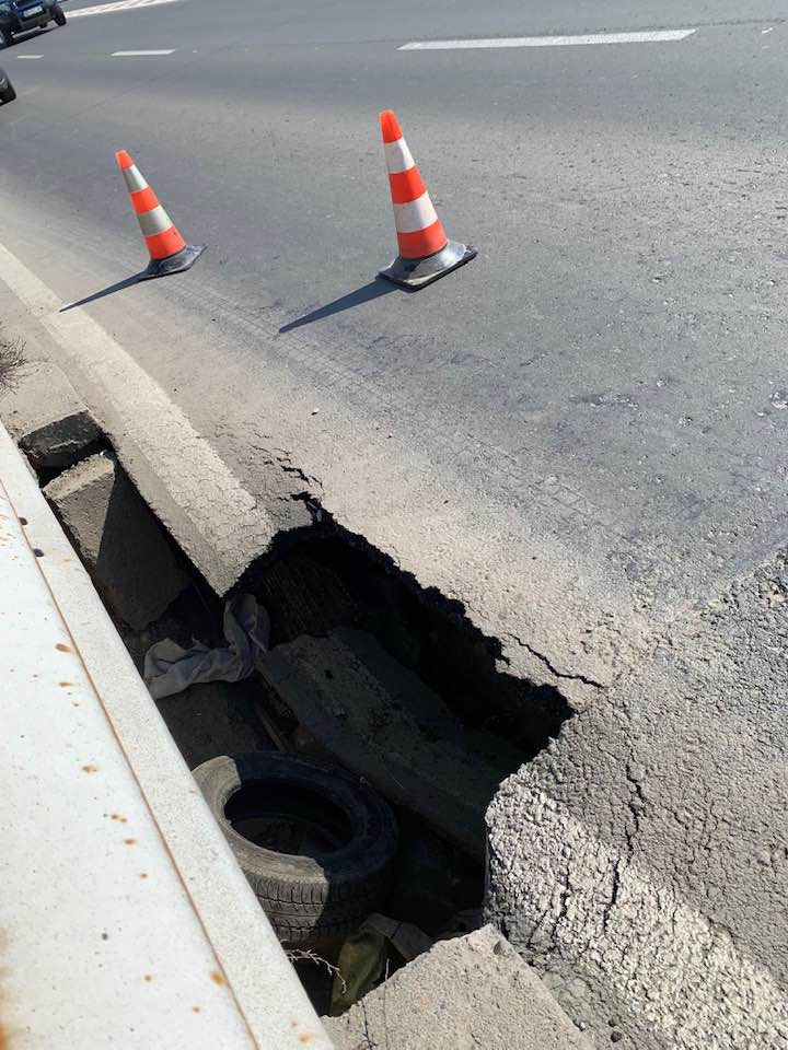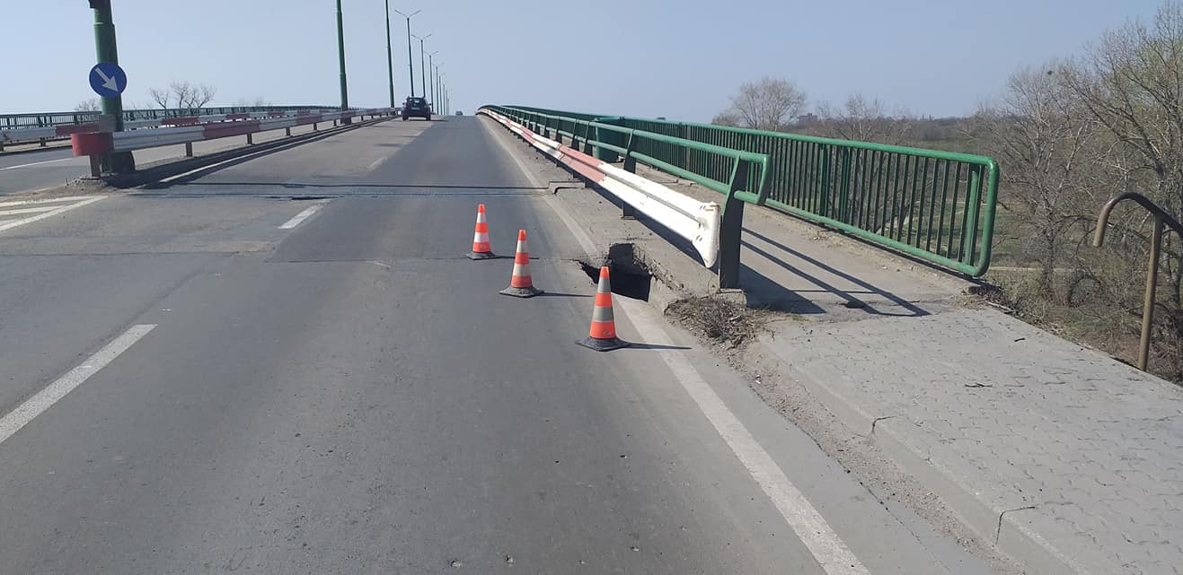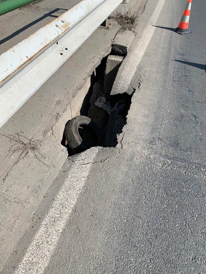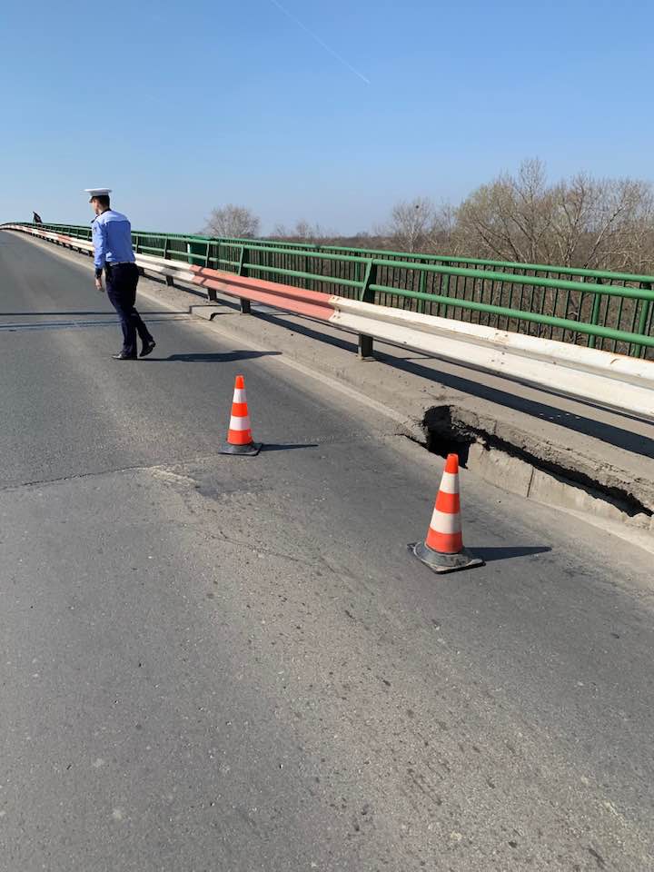 Este vorba despre surparea unei bucăţi de carosabil, pe podul care face legătura între Micălaca şi Subcetate.