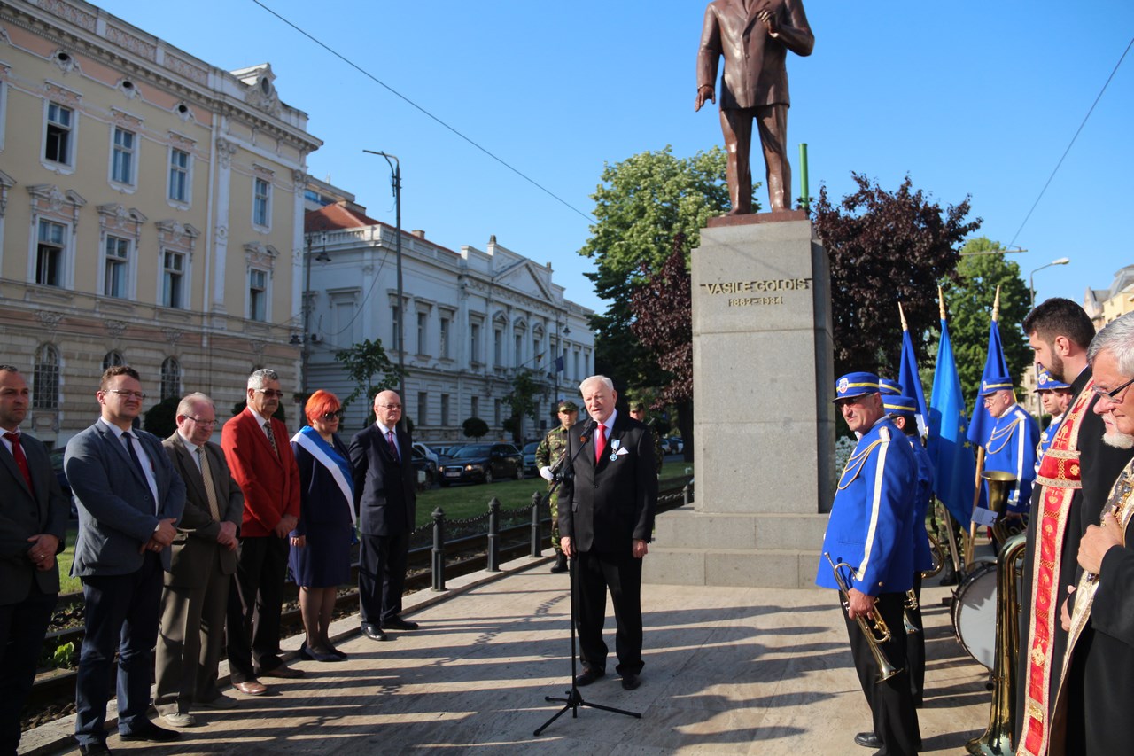 Manifestările au debutat cu un Te Deum susţinut de un sobor de preoţi la monumentul lui Vasile Goldiş, patronul spiritual al Universităţii care îi poartă numele. Prof. univ. dr. Aurel Ardelean, preşedintele Universităţii de Vest „Vasile Goldiş” din Arad, a subliniat rolul Corifeilor Marii Uniri şi a evocat personalitatea distinsului cărturar şi om politic, Vasile Goldiş, alături de care s-au aflat Ştefan Cicio Pop, Ioan Suciu şi alţi Corifei în pregătirea Unirii de la 1 Decembrie 1918.