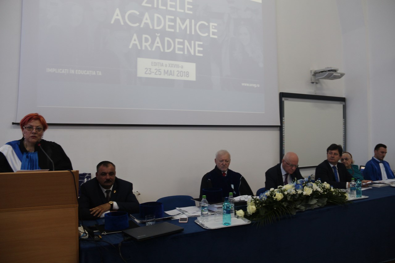 Ceremonia oficială a Zilelor Academice, ediţia a XXVIII-a, care s-a desfășurat în Aula „Magna Universitaria” din Campusul Universitar „Vasile Goldiș”, a fost deschisă de prof. univ. dr. Coralia Adina Cotoraci, rectorul Universității de Vest „Vasile Goldiș” din Arad, în prezența numeroșilor oaspeți – cercetători științifici, autorităților locale și judeţene, prorectori, decani, reprezentanţi a zece universităţi din ţară şi şase din străinătate, dintre care amintim Universitatea din California (SUA), studenți, masteranzi, doctoranzi, postdoctoranzi, absolvenţi ai UVVG.